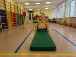Для физкультурных занятий имеется шведская стенка, скалодром, скамейки для ходьбы, степ-платформы, балансиры, обручи, координационные лестницы, фитболы, мячи, скакалки, дорожки движений, гимнастические маты, мягкие игровые модули, гимнастические палки и т.д.
